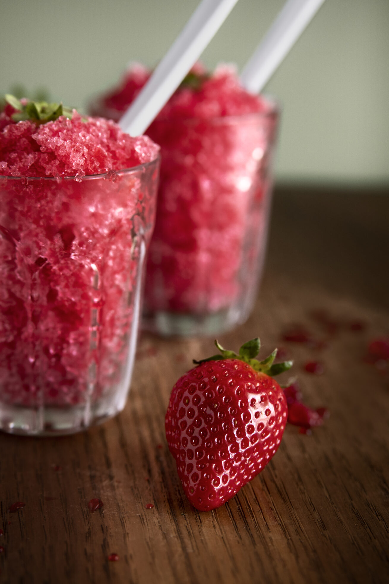 Frozen drink made with strawberry puree and ice, full of fruity flavor.