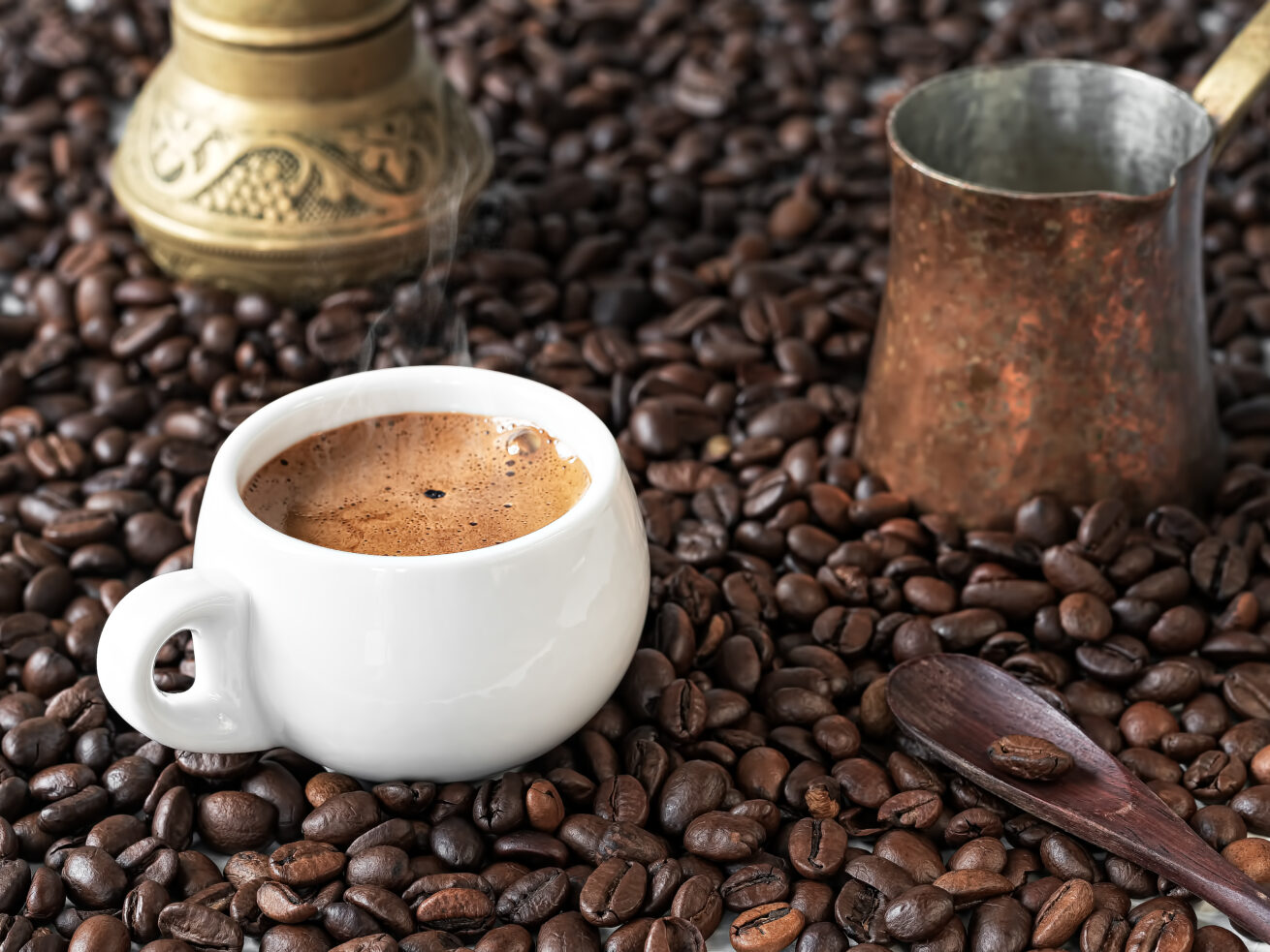 Traditional finely ground coffee boiled slowly in a copper cezve, served with foam.