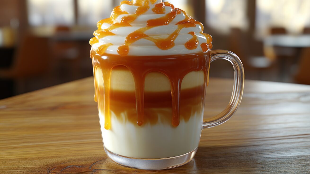 Espresso blended with steamed milk, salted caramel syrup, and milk foam.