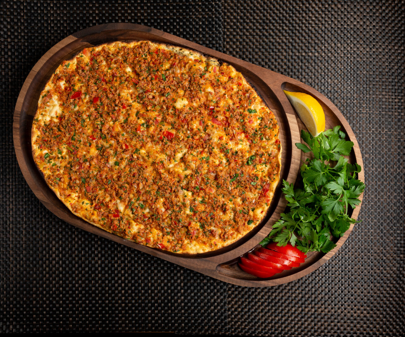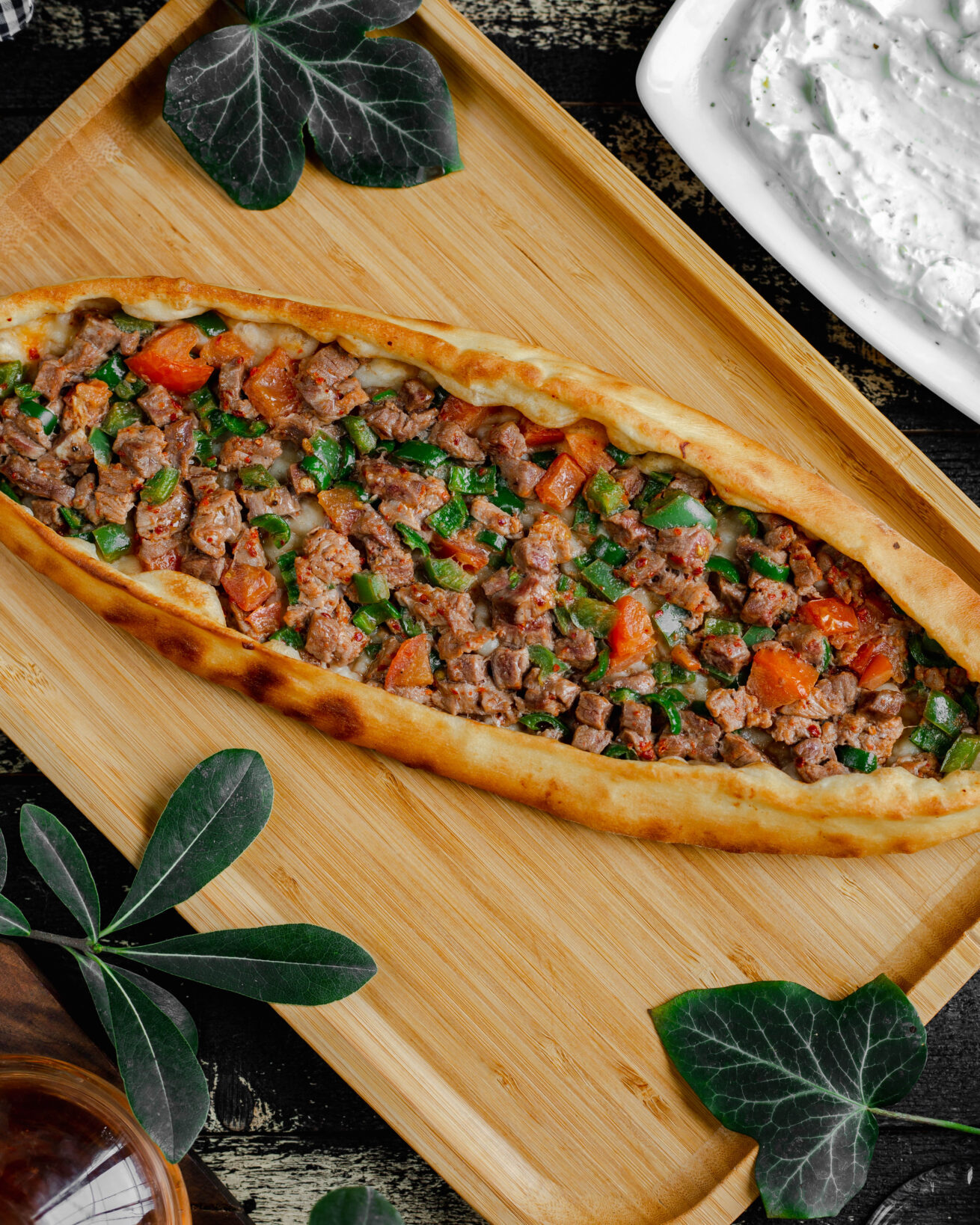Ground beef, sausage (sucuk), salami, mozzarella cheese, black olives, tomato, green pepper