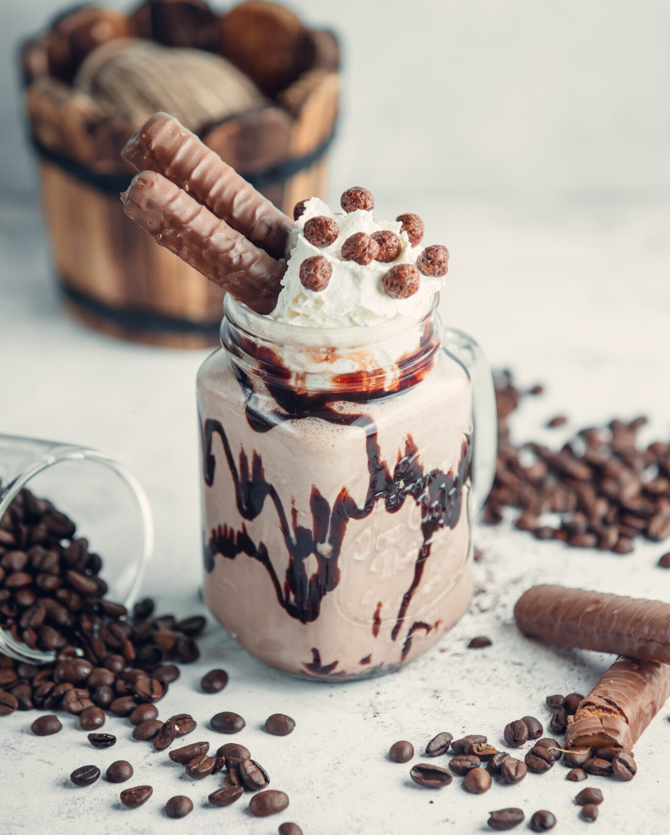 Iced blend of chocolate, espresso, and milk topped with whipped cream.