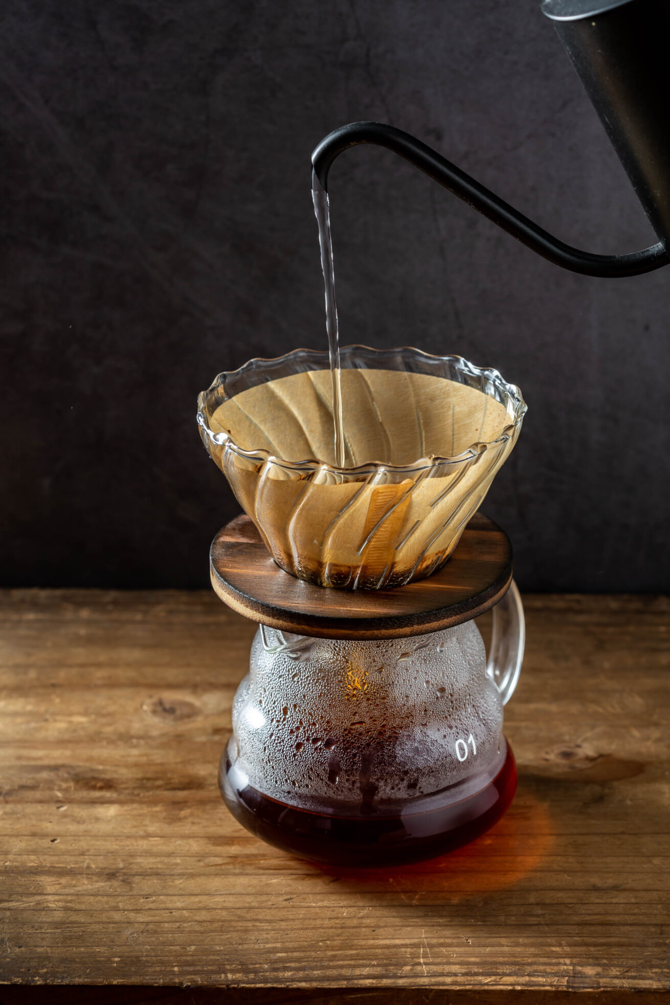Freshly brewed ground coffee prepared through a drip filter for a clean, classic taste.