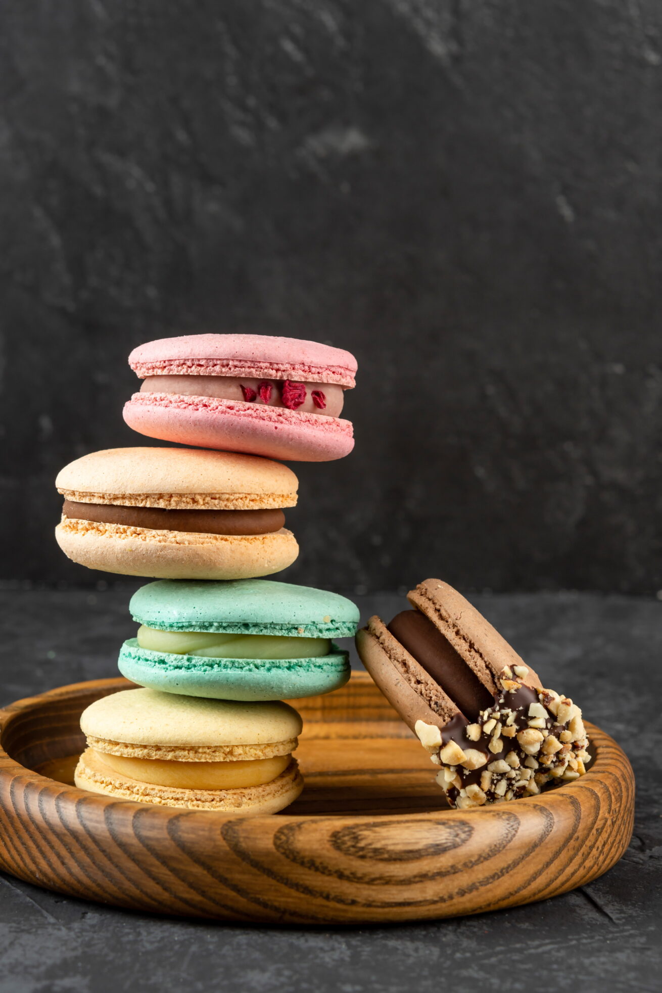 Colorful almond meringue cookies filled with soft flavored cream.